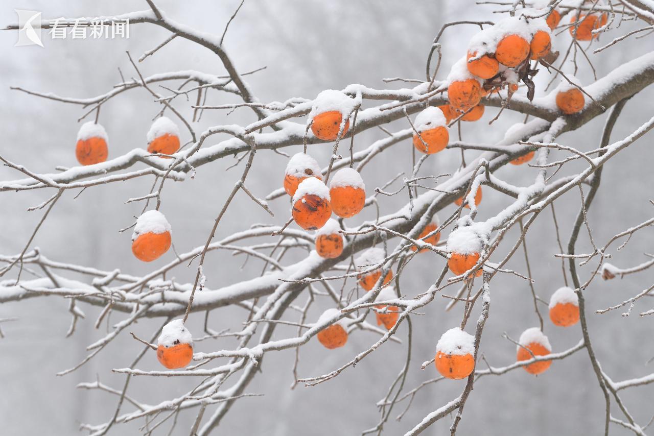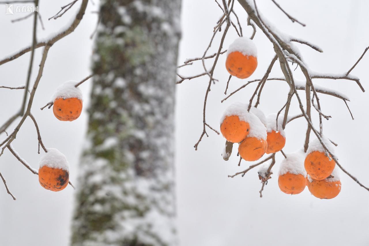 11月17日,湖北襄阳,保康县后坪镇詹家坡村,柿子被白雪覆盖。
