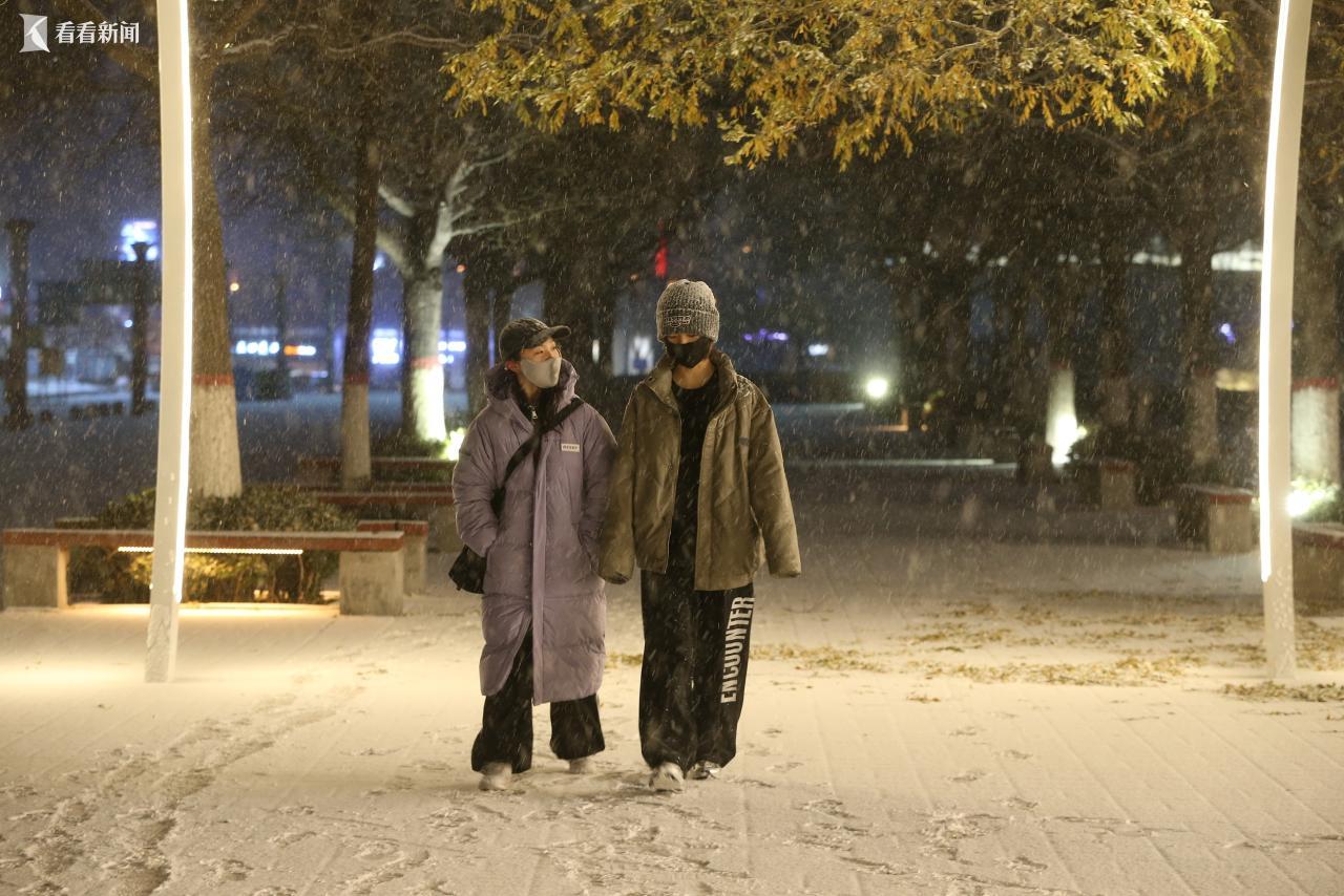 1月17日晚,青海西宁,市民漫步在雪景里。