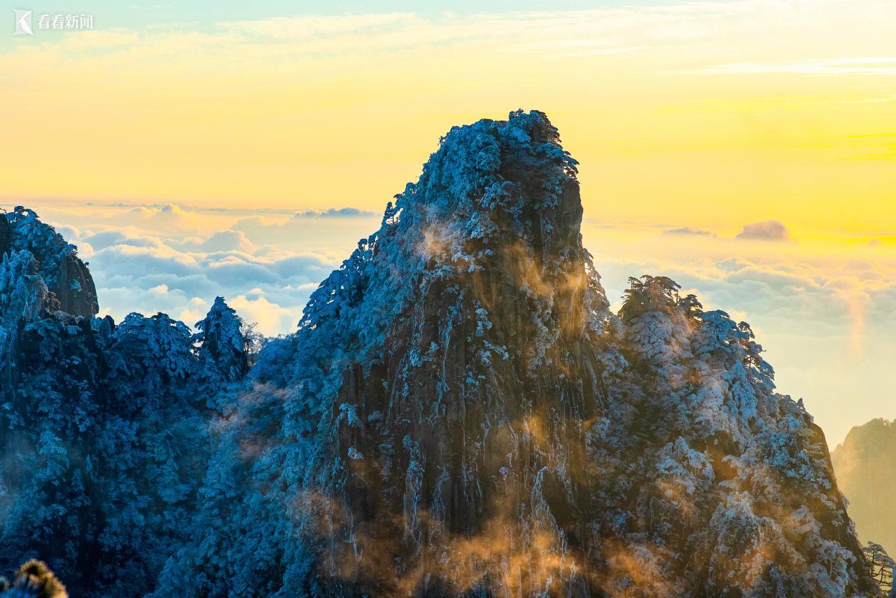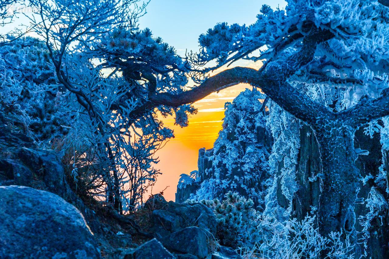 11月18日清晨,黄山雾凇、日出、云海同屏。