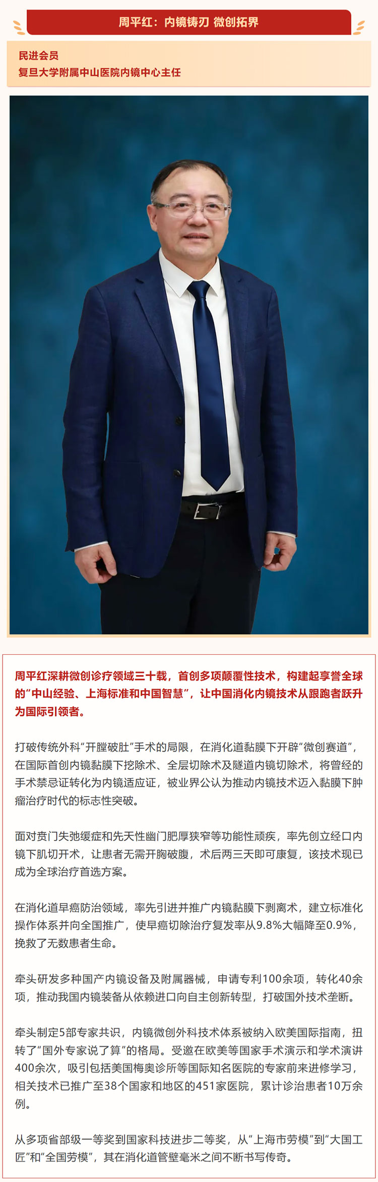 即日起,“浦江同舟”将为您逐一介绍这十位党外代表人士。本期,请看民进会员,复旦大学附属中山医院内镜中心主任周平红的事迹。