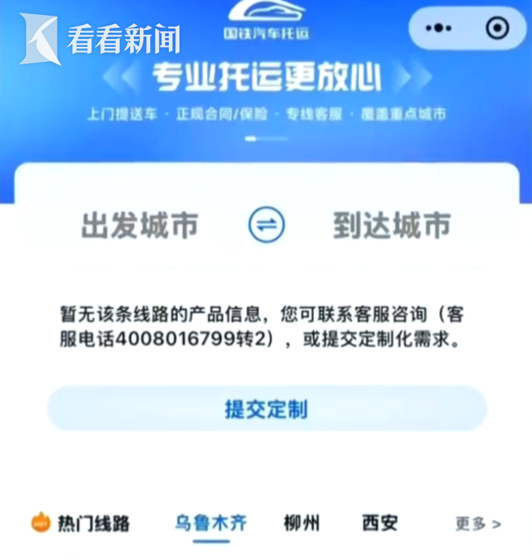 国铁汽车托运客服昨天(1月28日)介绍,目前已开通9条线路,出发城市包括柳州、西安、乌鲁木齐,全程封闭“点对点”运输,无需中途换车。运输时长约7到10天,价格区间948元至2706元。