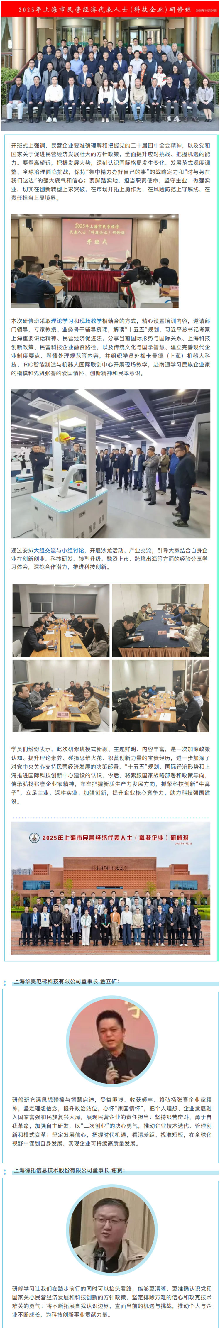 为学习贯彻党的二十届四中全会精神,引导民营经济人士完整准确全面贯彻新发展理念,推动科技创新、培育新质生产力,10月29日至11月4日,市委统战部、市科技工作党委、市工商联联合举办2025年上海市民营经济代表人士(科技企业)研修班。