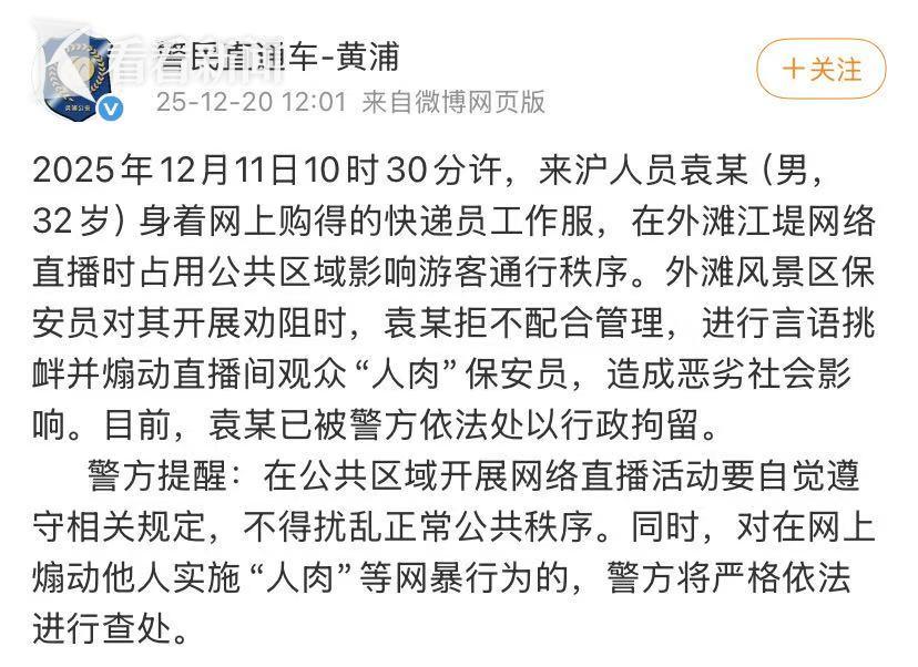12月11日10时30分许,来沪人员袁某(男,32岁)身着网上购得的快递员工作服,在外滩江堤网络直播时占用公共区域影响游客通行秩序。外滩风景区保安员对其开展劝阻时,袁某拒不配合管理,进行言语挑衅并煽动直播间观众“人肉”保安员,造成恶劣社会影响。目前,袁某已被警方依法处以行政拘留。