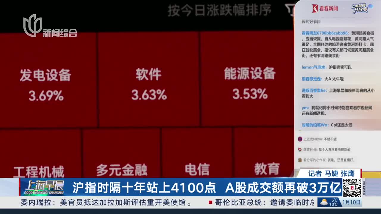 沪指时隔十年站上4100点 A股成交额再破3万亿