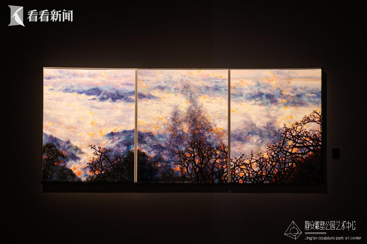 展览分为“火舞锦缠”与“云山苍茫”两大篇章。“火舞锦缠”源于艺术家在今年乙巳年新春的创作灵感,灵感来自冰岛火山的喷发之势与“木火相生”的东方传统哲思。作品气势磅礴,如视觉的史诗,将自然的爆发力、历史的回响与文明的烛火交织于画布上,展现了生命原始的热情与能量变革,又寄寓艺术家对时代的美好祝愿。