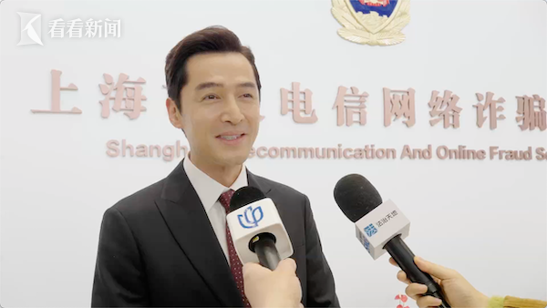 胡歌在现场讲述自己曾经遭遇的电信网络诈骗,并预祝市民群众新年快乐,守护好钱袋子。
