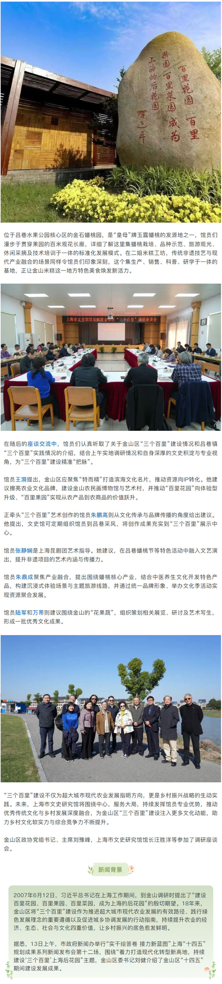 11月13日,上海市文史研究馆组织张静娴、曹旭、王孝俭、朱鼎成、齐铁偕、陆军、曹伟明、朱鹏高、汪家芳、王漪、万芾等11位馆员赴金山区吕巷镇开展馆员赋能“三个百里”调研,实地走访吕巷水果公园核心区等地,考察金山区吕巷镇推进“三个百里”建设情况,并通过座谈交流为金山区“三个百里”(百里花园、百里果园、百里菜园)建设建言献策。
