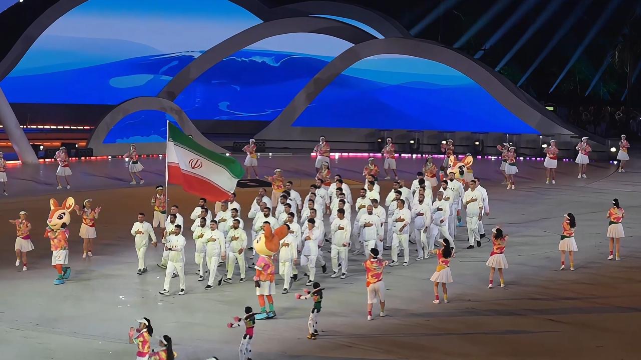 伊朗代表团如约参加三亚亚沙会。在昨晚(4月22日)的开幕式上,伊朗代表团高举国旗出场,全员身着白色服装,把右手放在胸前,神情严肃,全场观众送上掌声与欢呼。
