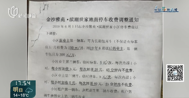 记者在小区里,看到一份落款为2019年5月的《小区停车规范调整通知》,上面明确写道:以2019年5月为界,小区原业主月租费为150元,2019年6月以后的新业主,第一辆车包月费为300元,从2019年6月1日起执行。