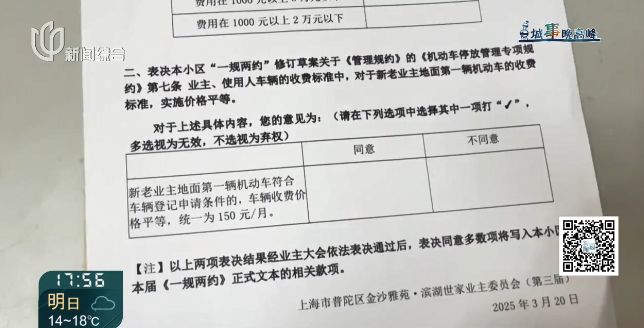 目前150元和一些300元的不同意见,我们现在主要还是结合小区实际的情况,包括一些周边小区的走访调查,我们会给到这个小区业委会的意见,最终采取什么样的一个小区停车管理规约,还是要交由小区的业主大会来进行表决通过。