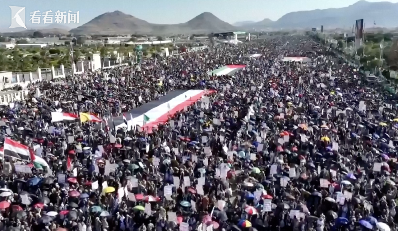 当地时间10月10日傍晚,也门首都萨那举行大规模集会,民众手持步枪和巴勒斯坦国旗等,庆祝加沙取得第一阶段停火胜利。