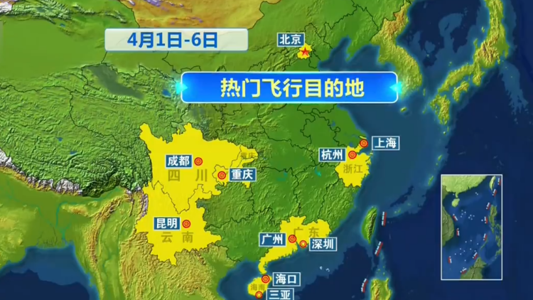 出行平台数据显示,4月1日至6日,上海、成都、北京、广州、深圳、昆明、杭州、重庆、海口、三亚等10个城市成为热门飞行目的地。