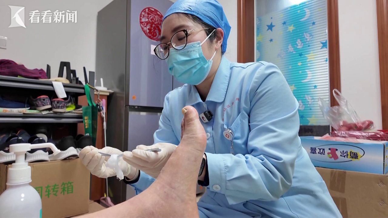 这样的上门“约会”,已经持续了大半年。看着老伴原本发黑的脚趾慢慢好转,81岁的朱凤珍阿姨眼圈红了:“这两只脚,真的是你帮他从鬼门关‘抢’回来的。要是以前,我们这种老人,去趟医院多难啊!”