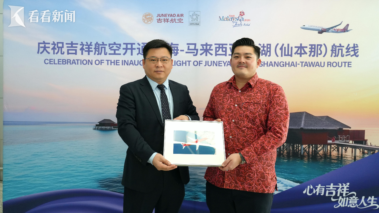 吉祥航空商务部总经理助理王春辉(左)和马来西亚旅游局上海办事处处长颜先生(右)双方共同祝贺吉祥航空斗湖航线首航成功