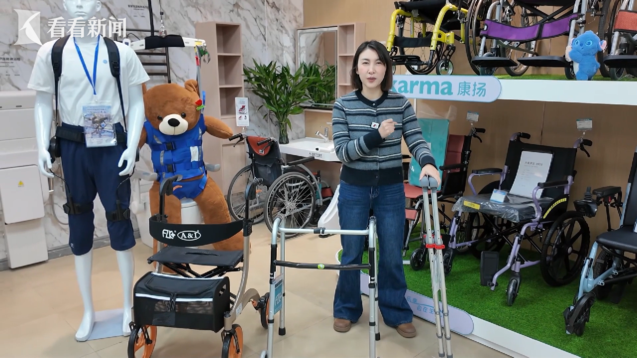 记者潘窈窈指着面前四款产品介绍说:“这四款完全体现了技术的迭代。这是1.0版本的拐杖,那是2.0版本的助行器,下面有两个轮子,更先进一点;3.0版本可以推着走;而这一款,是今年首次进入社区租赁目录的外骨骼助行机器人。”