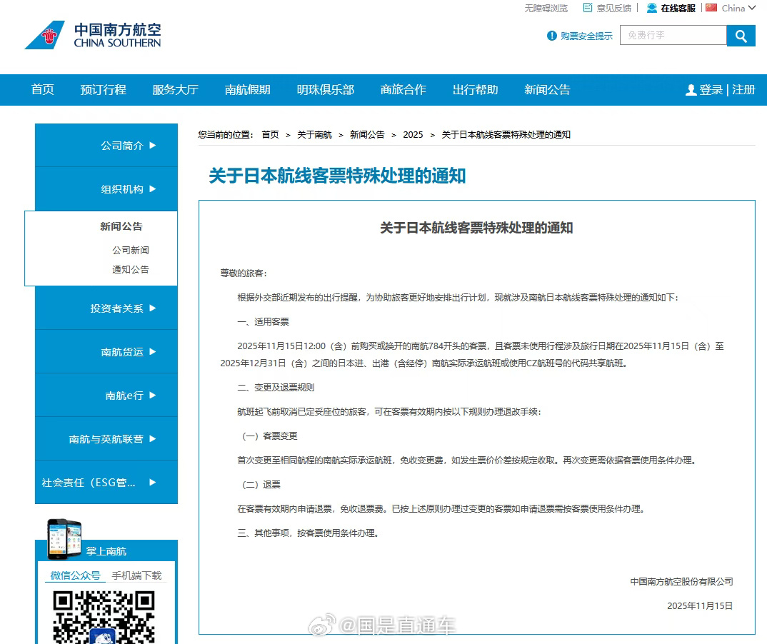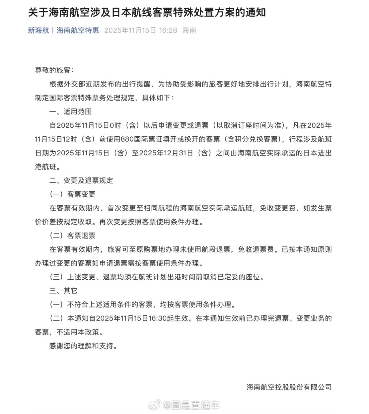 11月15日,中国南方航空股份有限公司发布《关于日本航线客票特殊处理的通知》,中国国际航空股份有限公司发布《关于发布国航涉及日本航线客票特殊处置方案的通知》,中国东方航空股份有限公司发布《关于日本相关航线客票特殊处理的通告》,海南航空控股股份有限公司发布了《关于海南航空涉及日本航线客票特殊处置方案的通知》。