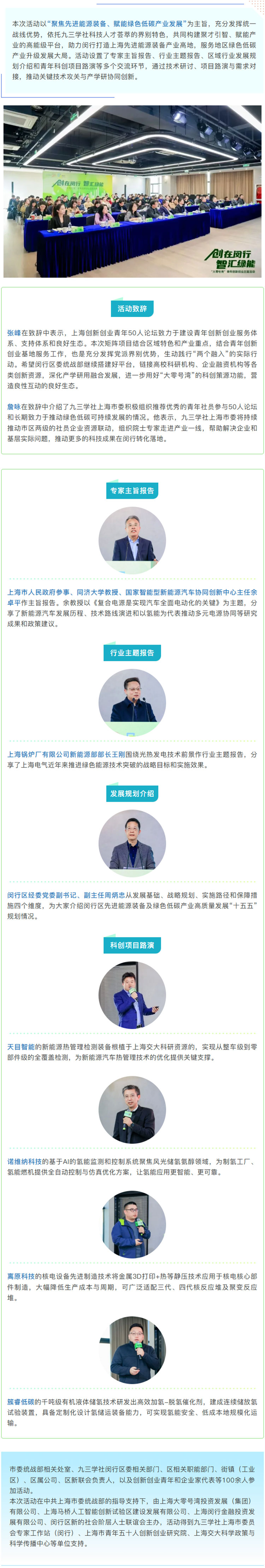 11月19日下午,“创在闵行 智汇绿能”大零号湾青年创新创业主题活动在闵行区成功举办。中共上海市委统战部副部长张峰,九三学社上海市委专职副主委詹咏,中共闵行区委常委、统战部部长吴继华,九三学社市委秘书长张磊,上海市青年五十人创新创业研究院院长陈凯、副院长李妍等出席活动。这是第六届上海创新创业青年50人论坛年度第46个矩阵项目。