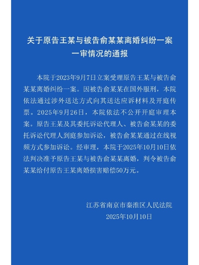 10月10日,江苏省南京市秦淮区人民法院发布《关于原告王某与被告俞某某离婚纠纷一案一审情况的通报》: