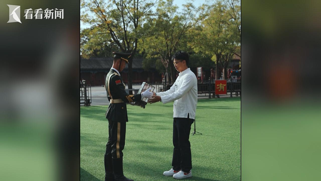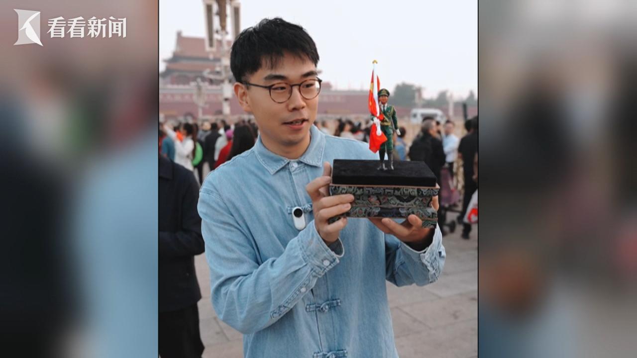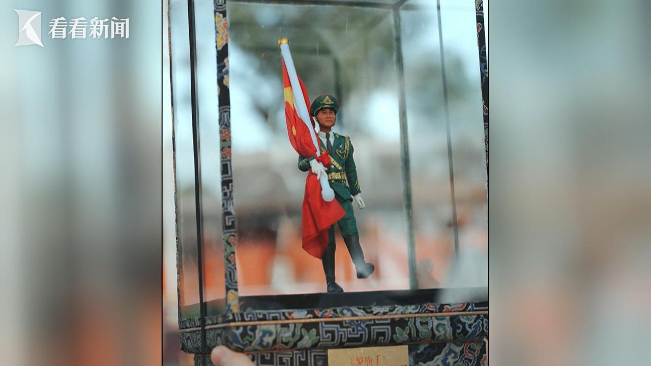 今年国庆节,他还用自己的独门绝技,为国旗护卫队的队员们,献上了一份特别的礼物。这是一个以擎旗手为形象的面人,原型来自国旗护卫队擎旗手张威。