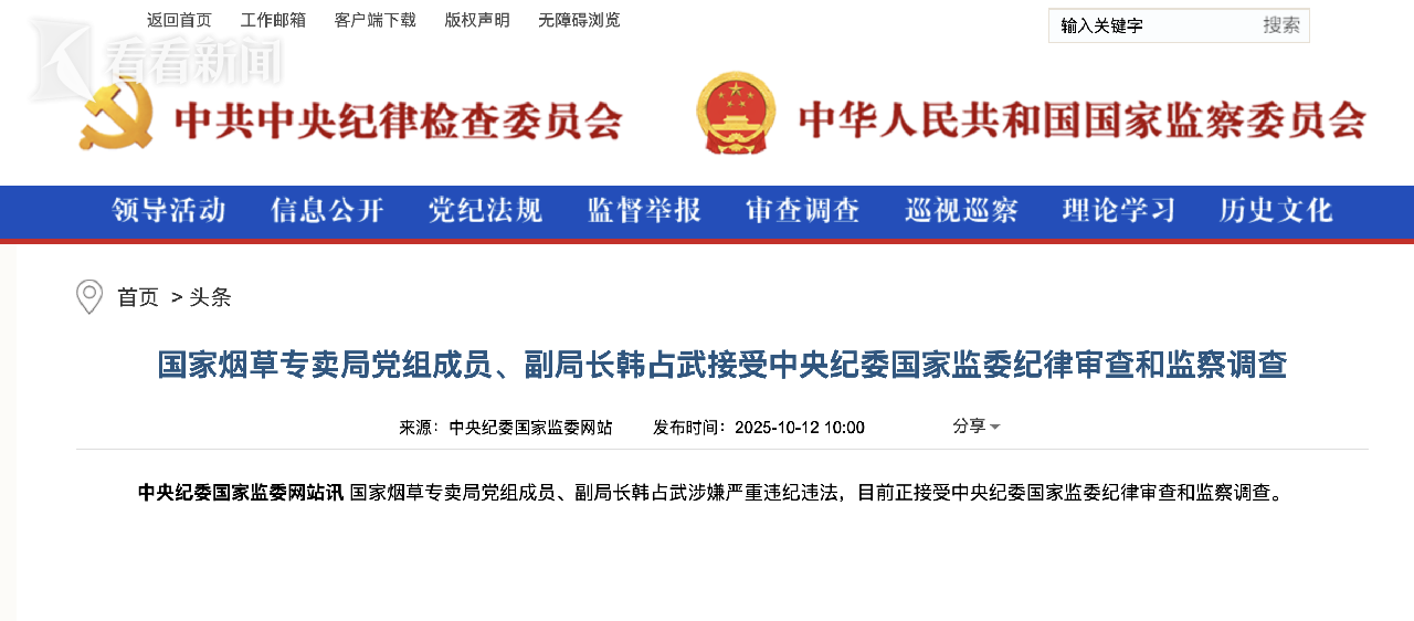 中央纪委国家监委网站10月12日消息:国家烟草专卖局党组成员、副局长韩占武涉嫌严重违纪违法,目前正接受中央纪委国家监委纪律审查和监察调查。