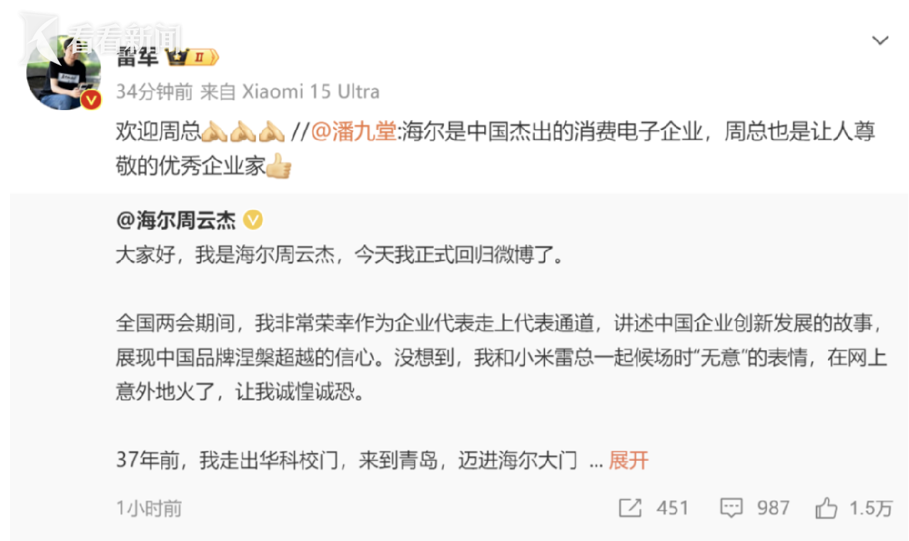 与此同时,周云杰还发布了首条微博,小米集团CEO雷军火速转发“欢迎周总”。