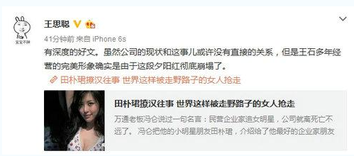 魏英杰:这个时候冒出一篇关于田朴珺的所谓撩汉这样的文章,我觉得非常可疑。特别是这篇文章措辞非常的激烈,有些事情讲的绘声绘色,好像人就在边上看一样,但是又没有什么过硬的证据。不管这是不是一种指东到西的打法,或者是不是有人要通过黑田朴珺来黑王石,这些文章包括这些说法,肯定都会影响人们对万科的看法。但是我觉得这是一种非常不负责任的说法,当天我就在朋友圈里面讲了,这种文章人家一告就是一个准,因为完全是这种捕风捉影的。然后按照这篇文章讲的,好像一切错误都是田朴珺造成的。王石完全是被带到沟里去了,我觉得这完全是“红颜祸水”的这种现代翻版。
