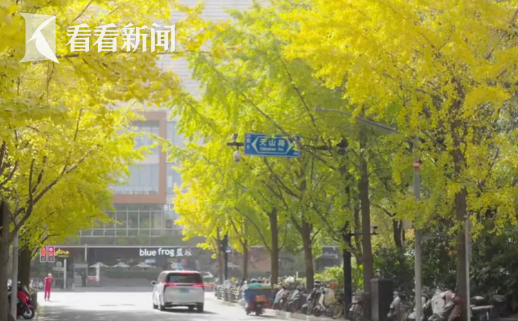 长宁区天中路上的银杏树叶片黄了,在阳光下十分耀眼。树叶随风飘落,铺在地面上,麻雀在上面闲庭信步。漂亮的街景惹人喜爱。