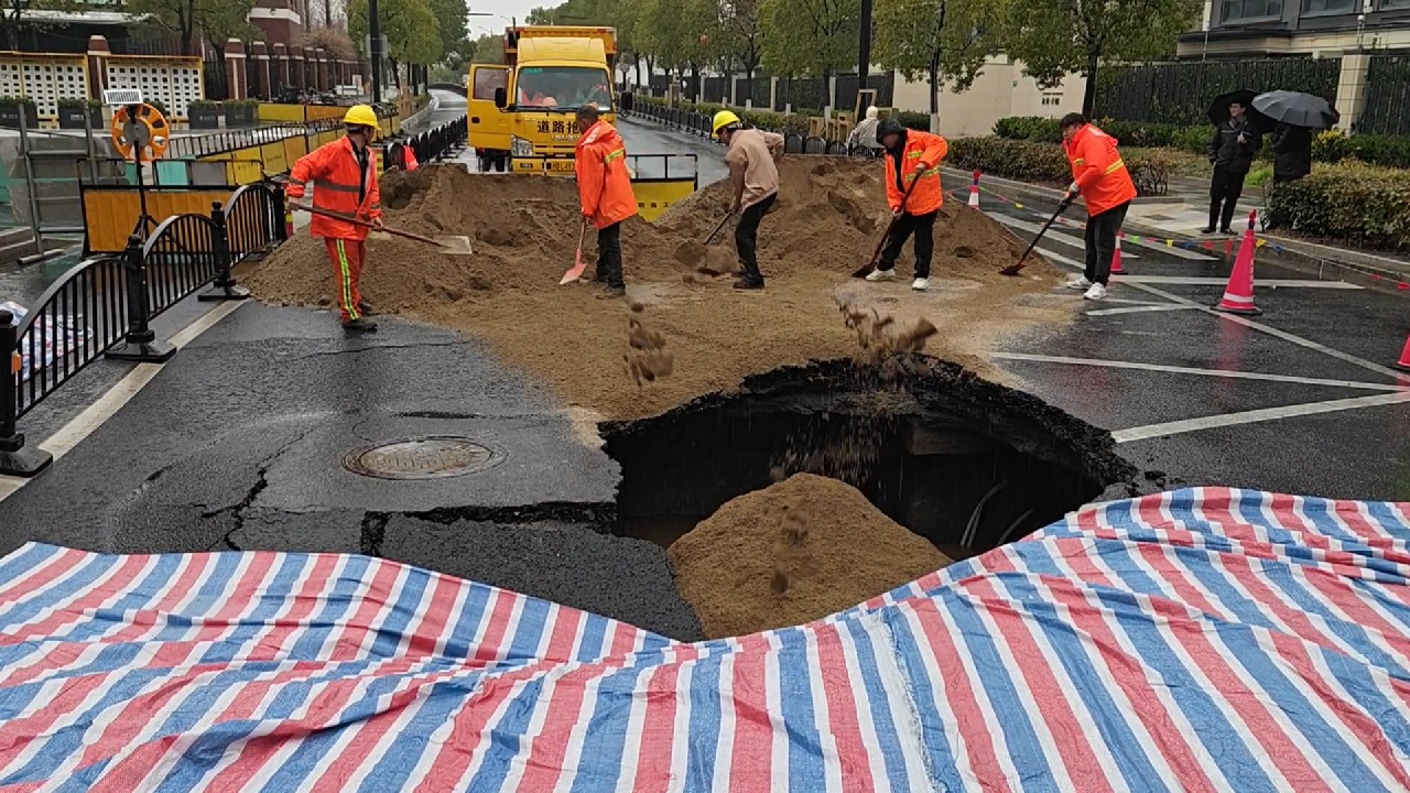 浦东方竹路路面沉陷 坑洞直径5米深2米