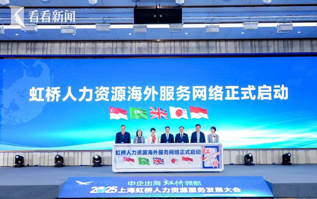 大会还举行了“虹桥人力资源海外服务网络”启动仪式。该海外服务网络聚焦构建关键出海目的地的服务链条,标志着虹桥服务中企出海“前沿站点”的正式落地,体现了从“国内服务枢纽”向“全球服务节点”的战略转型。首批站点涵盖英国、沙特、日本、新加坡、印尼五个重要国家,形成覆盖欧洲、中东、东亚、东南亚四大中企出海的核心市场。