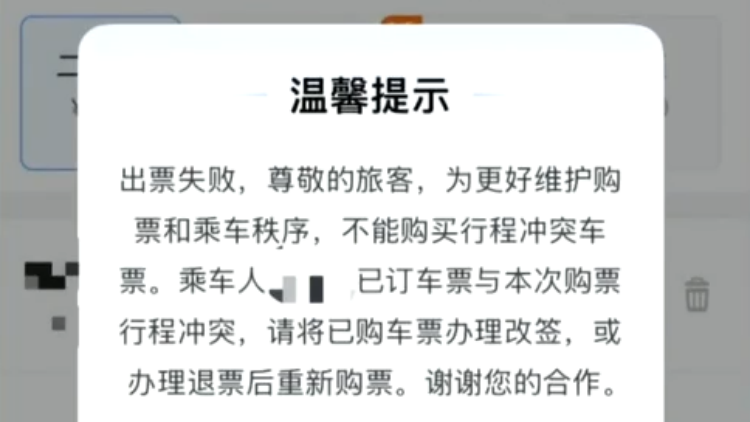 铁路部门介绍,系统会自动识别行程时间重叠、区间冲突的车票,依规拦截下单。这么设置,主要是防止旅客错购误购、避免一人占用多张车票,维护购票公平。