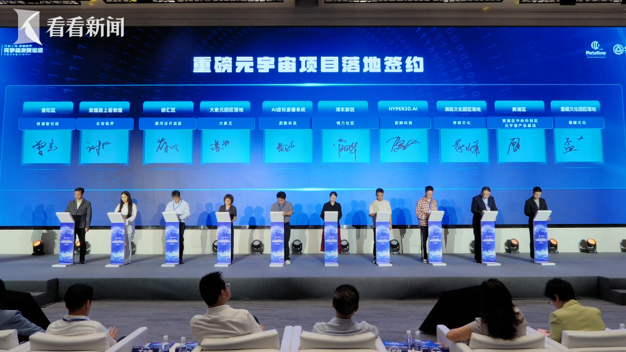 现场,第一批上海市元宇宙创新产品和解决方案优秀成果也正式发布,首批40项成果涉及数字内容、XR眼镜、服务平台、3D引擎、数字人、裸眼3D六个赛道。浦东、徐汇、黄浦、静安、普陀等区与多家元宇宙领军企业,就敦煌路上看敦煌、大象元园区落地、AI虚拟直播系统、重耀文化园区落地、上海浦东软件园园区数字孪生运营管理平台、人工智能超高清超分及修复平台等13个项目在现场完成签约,标志着市区两级联动、政企协同的元宇宙产业生态正在加速形成。全国首个《元宇宙成果分类和价值评价的团体标准》(征求意见稿)也正式发布,为产业健康、规范、可持续发展提供重要依据与指引。