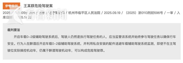 2025年9月13日零时30分许,被告人王某群饮酒后,抱着侥幸心理驾驶装有2级辅助驾驶系统的机动车。驾驶一段距离后,王某群从主驾驶位移至副驾驶位,利用其私自安装的“智驾神器”,绕开系统监测,让车辆在无人监管状态下持续行驶。
