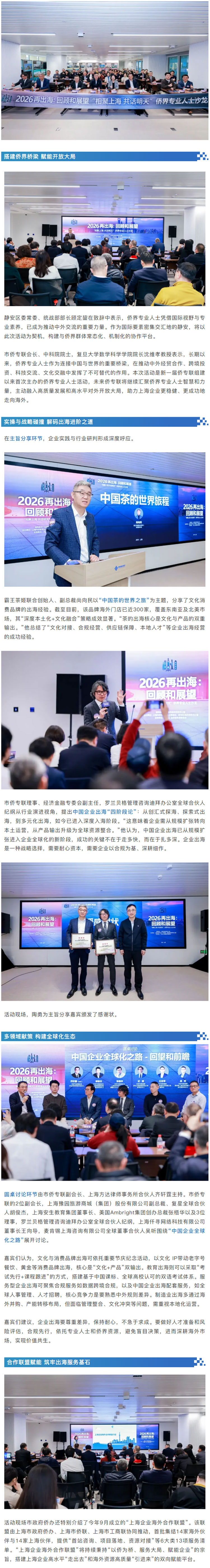 在全球贸易格局深度调整、中国企业出海迈入“深度入海”新阶段的背景下,“2026再出海:回顾与展望”——“相聚上海 共话明天”侨界专业人士沙龙近日于上海市静安区举行。上海侨界专业人士齐聚一堂,结合实操经验与行业洞察,共探中国企业全球化的新机遇与新路径。