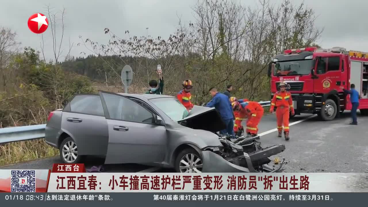 江西宜春:小车撞高速护栏严重变形 消防员“拆”出生路