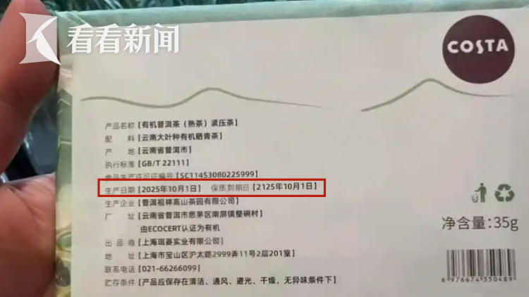 近日,有消费者反映,在电商平台购买的COSTA有机普洱茶“熟茶”紧压茶产品盒包装上看到,保质期长达100年。
