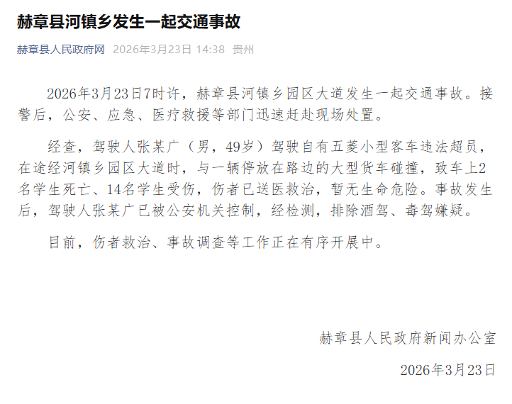 驾驶人张某广(男,49岁)驾驶自有五菱小型客车违法超员,在途经河镇乡园区大道时,与一辆停放在路边的大型货车碰撞。