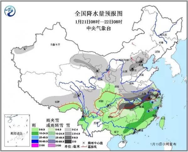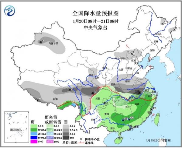 中央气象台预计,20日到23日,江淮及其以南地区将出现由雨转雪,其中,湖北、安徽南部、江苏南部、上海、浙江中北部、江西中北部、湖南中北部等地有小到中雨转大到暴雪,浙江中北部局部地区有大暴雪。湖南、贵州的部分地区在21日到22日将出现冻雨天气。上述地区积雪深度5~10厘米,部分地区可达15~20厘米。