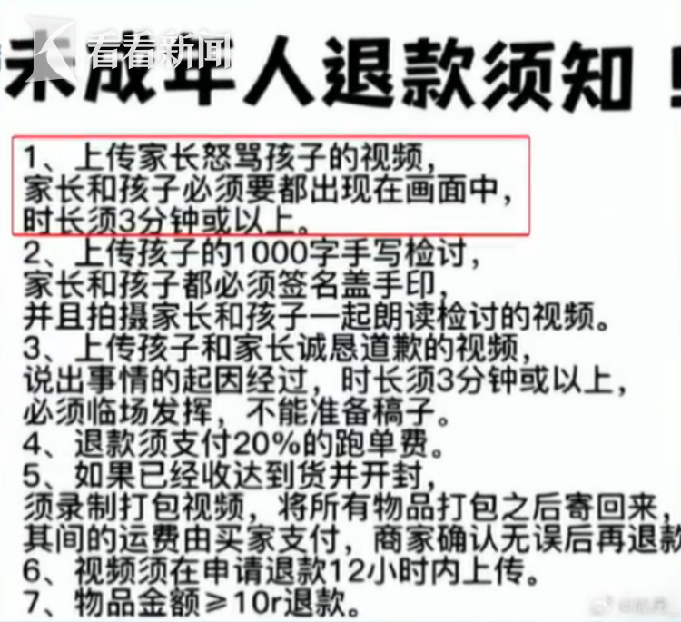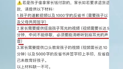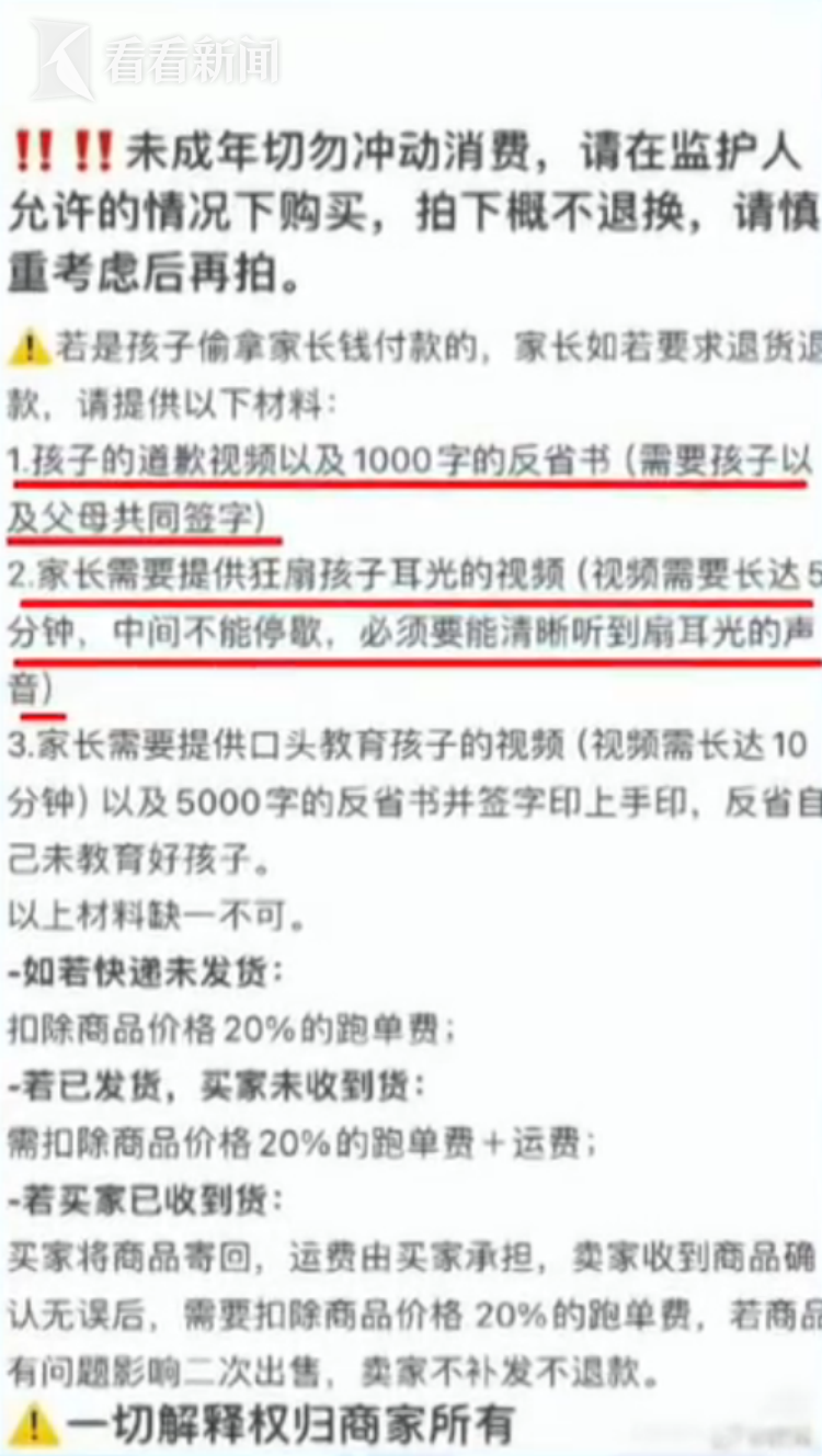 据孩子母亲爆料,其在与部分卖家的沟通中,对方提出极端条件,其中包括:上传家长持续怒骂孩子3分钟的视频(需双方同框);提供狂扇孩子耳光5分钟的视频(要求声音清晰、中间不停顿);附加孩子手写1000字检讨书、家长签字盖手印及朗读视频等材料。