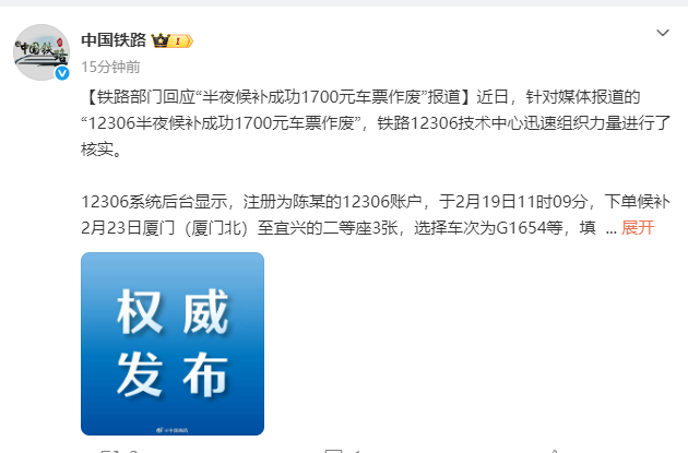 近日,针对媒体报道的“12306半夜候补成功1700元车票作废”,该中心迅速组织力量进行了核实。