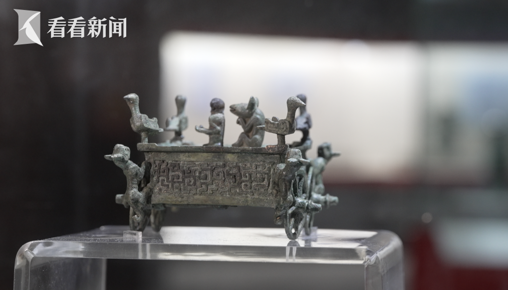 蟠虺纹车型器由盒体和轮轴两部分组成,也被称为“四轮方盒”。盒体遍布蟠虺纹,盒盖上端坐着一人一熊,四边各有一只向上攀援的虎,盒盖四角立着四只凤鸟,像一座移动的“动物园”。凤鸟暗藏机关,旋转至不同的方位即可上锁或打开。