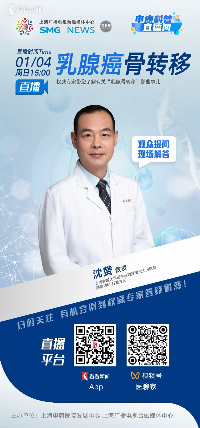 乳腺癌是女性中最常见的恶性肿瘤之一,其中骨转移是最常见的远处转移部位。乳腺癌骨转移不仅会显著降低患者的生活质量,导致骨痛、骨折、脊髓压迫等严重并发症,还会对预后产生重要影响。随着诊疗技术的发展,乳腺癌患者的总体生存时间逐步延长,骨转移的发生率和临床关注度也随之增加。如何早期识别、科学预防、规范治疗乳腺癌骨转移,已经成为乳腺癌全程管理中的关键环节。深入探讨乳腺癌骨转移的防治策略,对于改善患者生活质量、延长生存周期、实现精准治疗具有重要的现实意义。为此,本期节目我们非常荣幸地邀请到上海交通大学医学院附属第六人民医院肿瘤内科行政主任沈赞教授做客直播间。