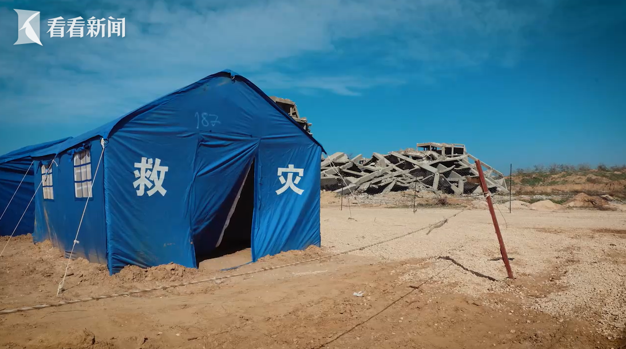 纷飞的战火中,来自中国的帐篷在关键时刻运抵。大片整齐的蓝色帐篷,印着“救灾”的中文字样,在断壁残垣间分外醒目。