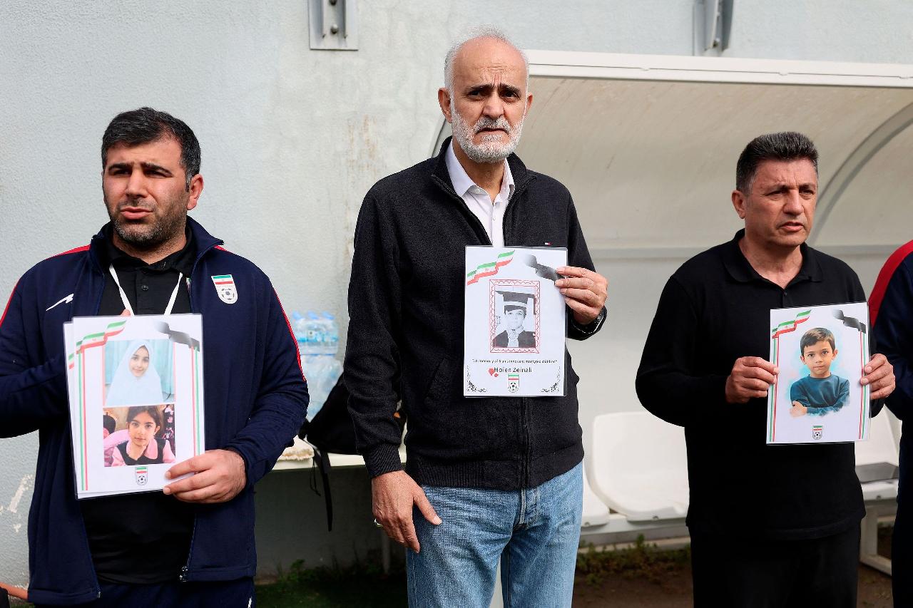 当地时间3月31日,土耳其安塔利亚,伊朗足协副主席、主教练(右)在伊朗与哥斯达黎加的友谊赛前,手持据称在美国对伊朗的空袭中遇难儿童的照片合影。