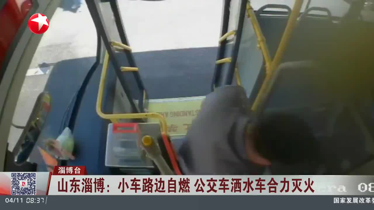 山东淄博:小车路边自燃 公交车洒水车合力灭火