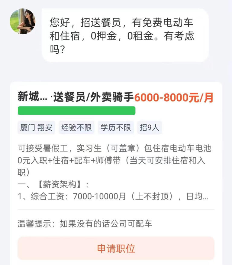 小林回忆,租给他的那辆车非常破,第一天跑了一整天才跑完免租金所需的单量。当时他就意识到不对劲了。招聘方以“招聘骑手”的名义让自己去租车,但实际上是签“众包”,和平台方根本没有挂钩,所谓的跑单任务是很难完成的。福建厦门的陈先生有着相同经历,招聘方承诺的所谓免费,都是套路。