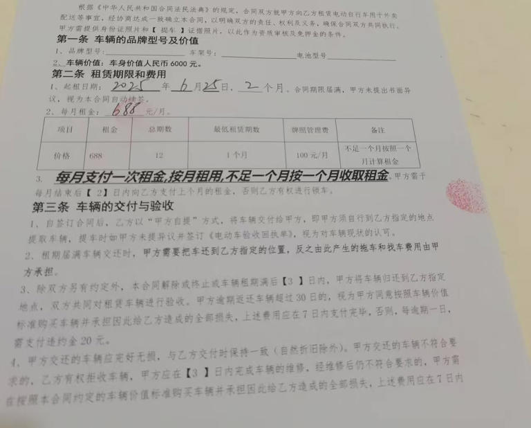去年6月,高中毕业的小林想找一份暑期兼职,网上宣称“免押金、待遇好”的骑手招聘广告,让他动了心。在线下门店,对方声称要签订电动自行车租赁协议,合同期两个月,每个月租车费为688元,但只要完成一定的单量,就免租金。