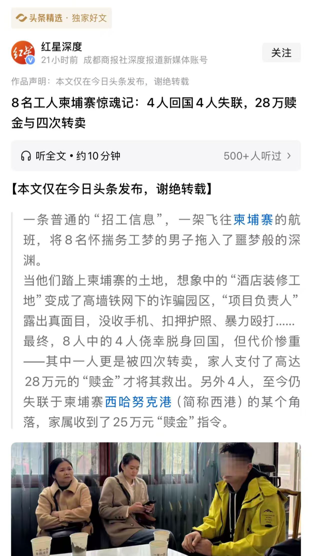 “金边酒店装修,急需10多名木工。”这样的信息对常年在工地谋生的人而言,无疑充满诱惑。8名工人中6人有出国务工经验,有的曾在老挝靠手艺安稳赚钱,还说熟练的技术工在当地每天能拿到600元-800元不等。这份 “经验自信”,再加上 “熟人介绍” 的幌子,让他们放弃了通过正规中介的流程,轻易踏上了赴柬之路。