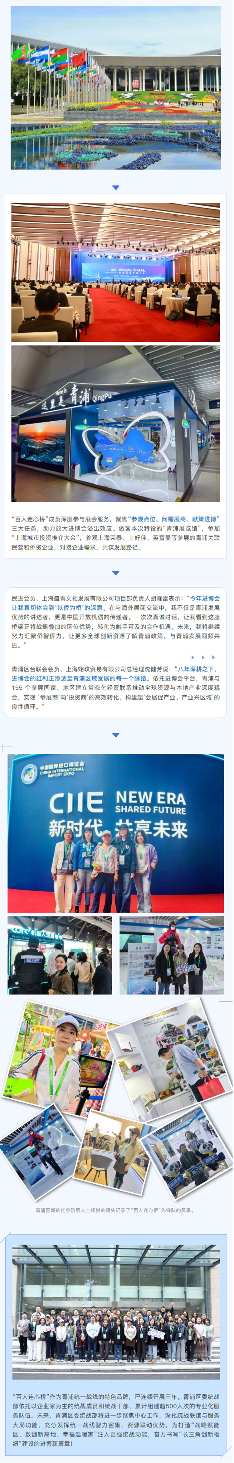 11月6日,青浦区委统战部组织开展“同心善行 聚力进博——百人连心桥”走进进博主题活动,首批由各民主党派成员、民营企业家代表等组成的70位成员整装出发共赴国家会展中心参与这场家门口的盛会。自9月份组织报名以来,青浦全区统战团体积极组织发动、各领域统战成员踊跃报名,共征集到“百人连心桥”成员169位。