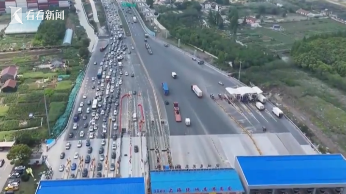 今天午后,从高空俯瞰,通往G1503高东收费站的五洲大道上,不出意外地出现了出城高峰,前往崇明、启东方向的车流源源不断。