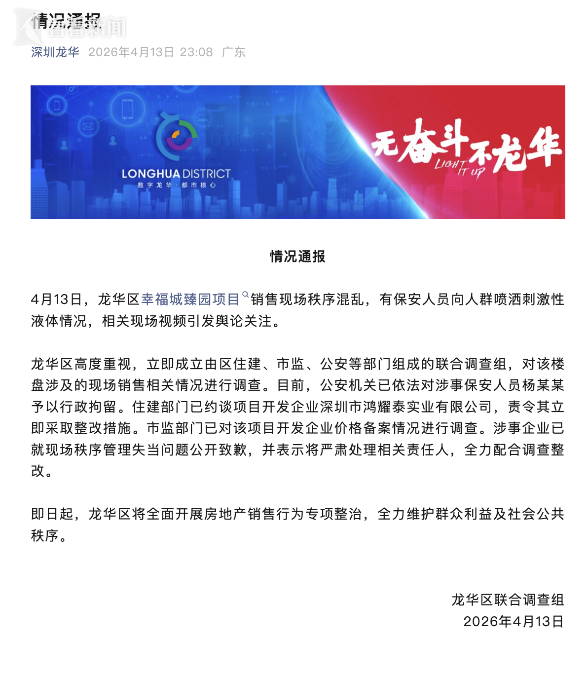 “楼盘遭哄抢、保安向人群喷辣椒水?”昨晚(4月13日),深圳龙华区联合调查组发布情况通报,涉事保安已被行政拘留。当地住建局已约谈涉事企业责令立即整改。市监部门已就价格备案情况进行调查。